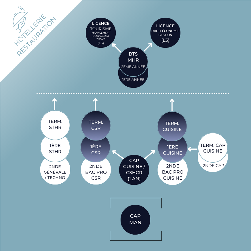 Cuisinier, maître d’hôtel, manager dans l’hôtellerie et la restauration, concierge, réceptionniste, sommelier, serveur ou barman… À Jeanne Delanoue, nos différentes formations proposées s’ouvrent à tous ces différents métiers.